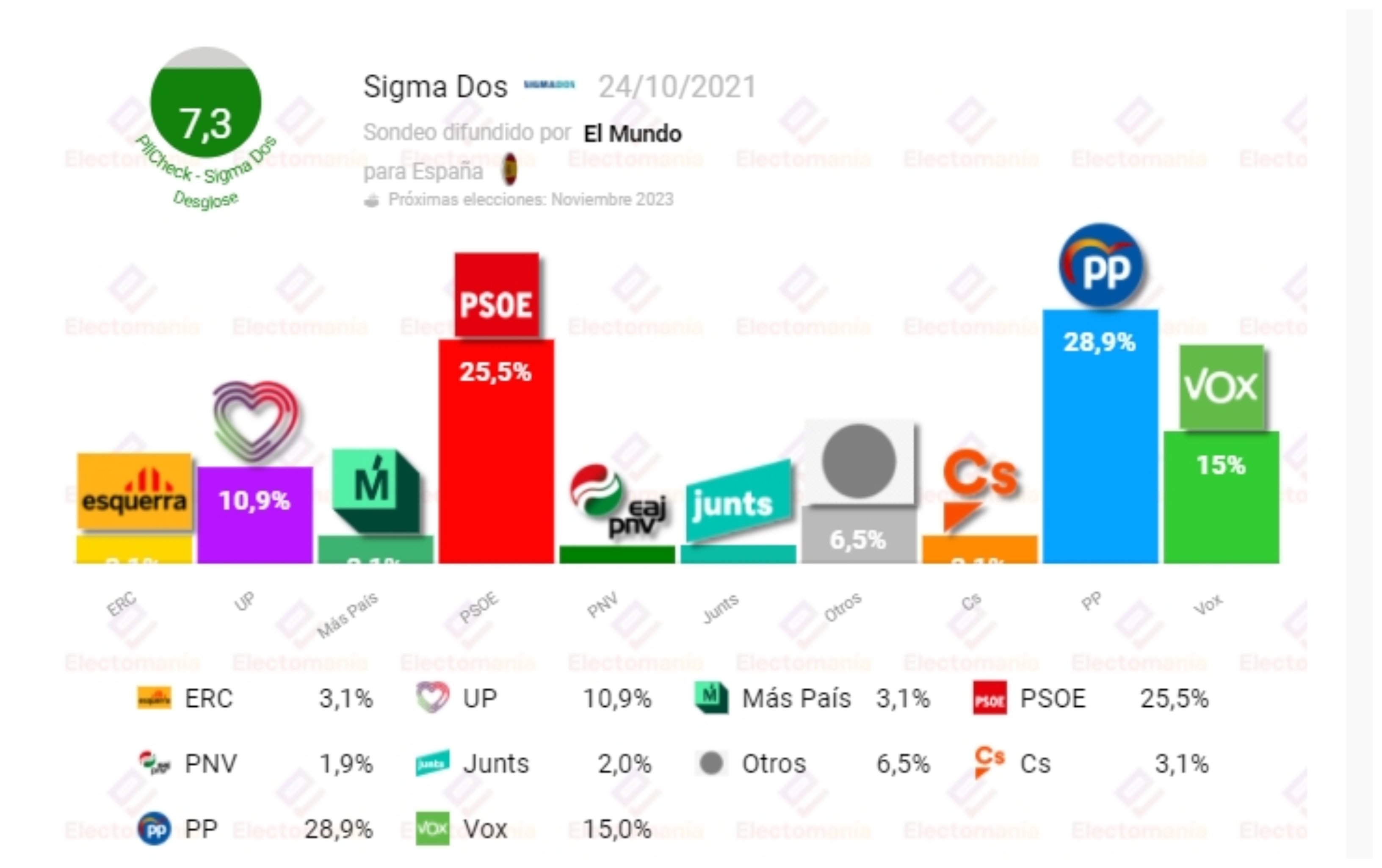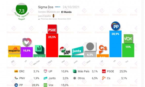 Por su parte, Electomanía publicó ayer también una encuesta según la cual el PP sacaría el 27,8% de los votos y 117 escaños. El PSOE, el 25,8% y 100 escaños. Vox, el 17,3% y 57 escaños. Unidas Podemos, el 10,5% y 25 escaños. Más País, el 2,4% y 6 escaños. Y Ciudadanos, el 2,7% y 1 escaños.