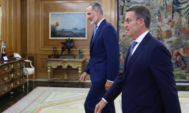 El presidente del PP, Alberto Núñez Feijóo, ha comparecido al término de su reunión con el Rey Felipe VI: "Le he trasladado dos reflexiones: la primera, una valoración positiva del encargo que me hizo y la segunda, el absoluto respeto que adopte el jefe del Estado con respecto a segunda o sucesivas investiduras".