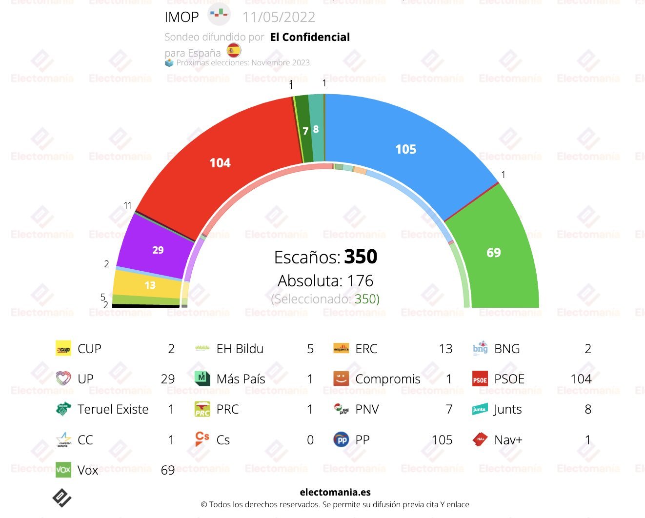 Hoy El Confidencial publica una encuesta de IMOP según la cual, el PP sacaría el 26,4% de los votos y 105 escaños.
