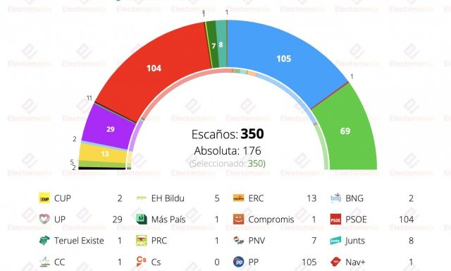 Primero, como siempre, recordemos los resultados de las últimas elecciones generales del 10 de noviembre de 2019: el PSOE sacó 120 escaños y el 28% de los votos. El PP, 89 y el 20,8%. Vox, 52 y el 15,1%. Podemos, 35 y el 12,8%. Y Ciudadanos, 10 y el 6,8%.