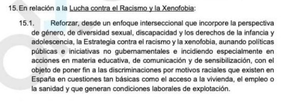 La medida aparece recogida en el texto de la ponencia que ya se tramita en el Senado y se encuentra en el apartado ‘Lucha contra el Racismo y la Xenofobia’. Allí aparecen distintos puntos, como la exigencia de “reforzar, desde un enfoque interseccional que incorpore la perspectiva de género, de diversidad sexual, discapacidad y los derechos de la infancia y adolescencia, la Estrategia contra el racismo y la xenofobia, aunando políticas públicas e iniciativas no gubernamentales e incidiendo especialmente en acciones en materia educativa, de comunicación y de sensibilización, con el objeto de poner fin a las discriminaciones por motivos raciales que existen en España en cuestiones tan básicas como el acceso a la vivienda, el empleo o la sanidad y que generan condiciones laborales de explotación”.