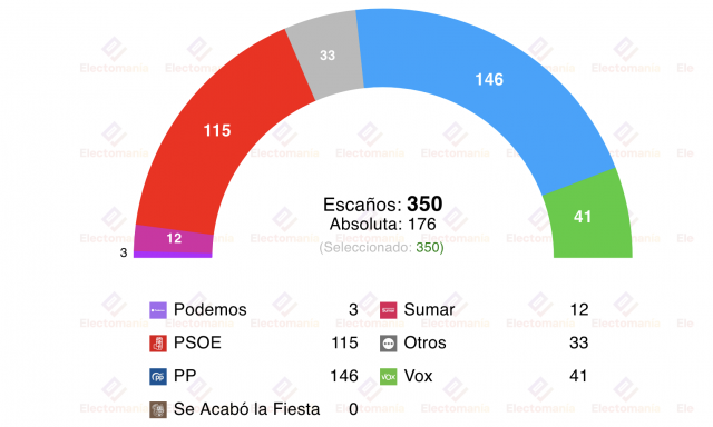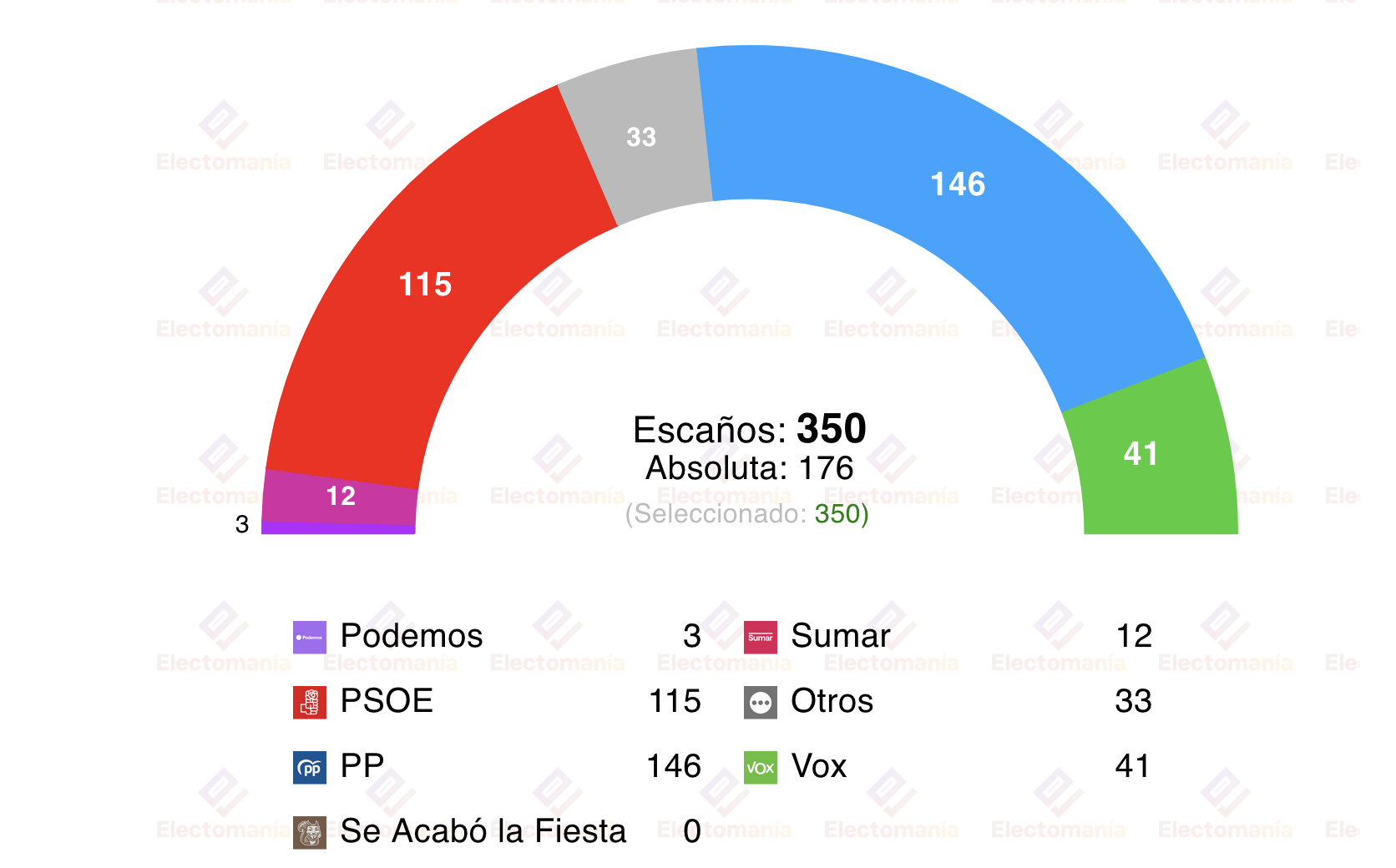 Así las cosas, los resultados de esta encuesta son similares a los de las últimas encuestas privadas: el PP en torno a 150 escaños; el PSOE en torno a 115; Vox en torno a 40; y Sumar con unos 9-10.