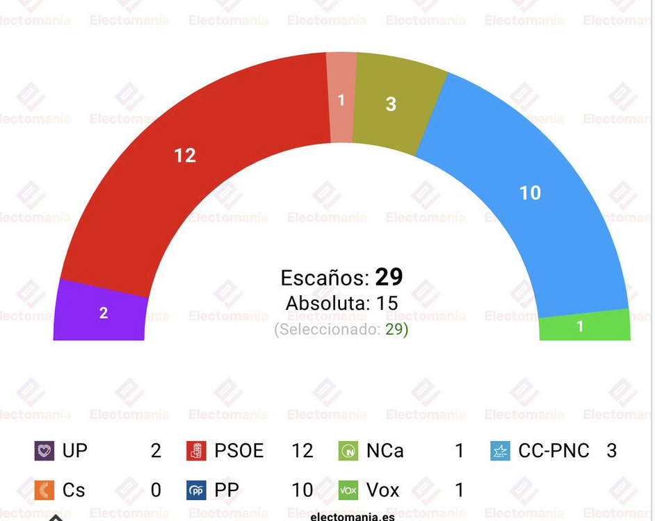 Según una encuesta de Sigma 2 para Antena 3, recogida por Electomanía, el PSOE obtendría 12 concejales. El PP se haría con 10. CC-PNC tendría 3. Unidas Podemos, 2. NCa 1. Y Vox 1.