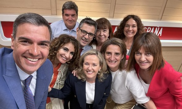 Pues bien, por primera vez la hemos visto -lunes 12- en una rueda de prensa, en Ferraz, donde el presidente y varios miembros del Gobierno se han reunido en lo que se ha llamado grupo de coordinación para el programa del partido de cara al 23-J. Algo muy importante.
