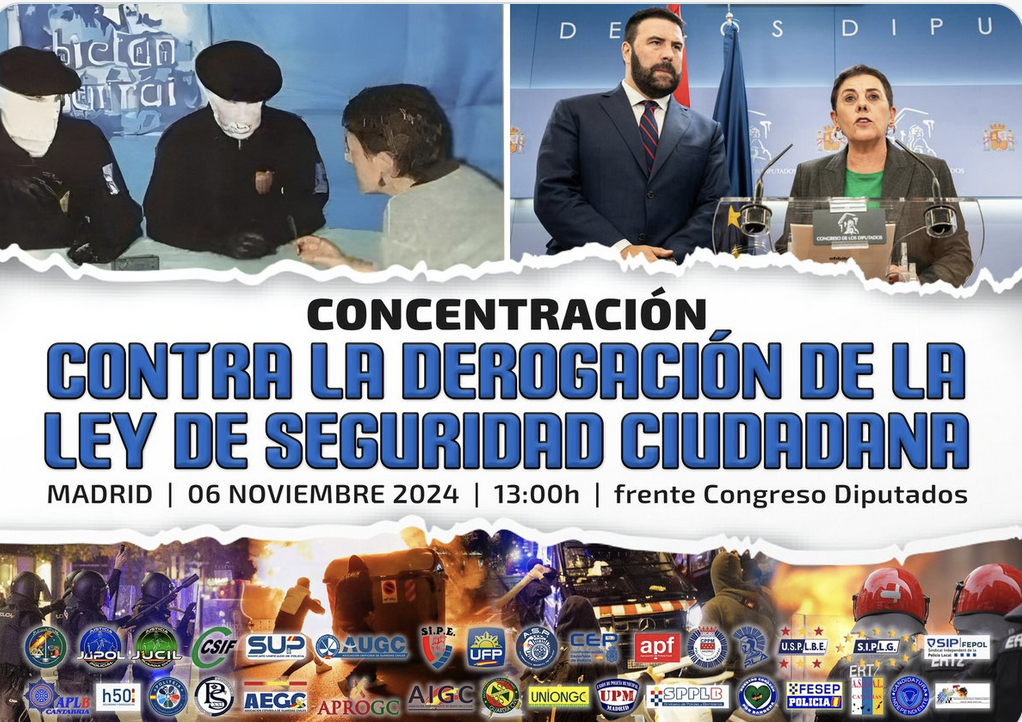 Hasta 18 sindicatos y asociaciones policiales, entre las que figuran Jupol (sindicato mayoritario en la Policía Nacional), Jucil (Asociación Profesional Justicia Guardia Civil), Jusapol o el sindicato profesional de la Ertzaintza Si.P.E, se manifestarán el próximo miércoles 6 de noviembre, a las 13:00 horas, delante del Congreso de los Diputados, para oponerse a la derogación de la ley de Seguridad Ciudadana (bautizada despectivamente por la ultraizquierda como 'ley mordaza).