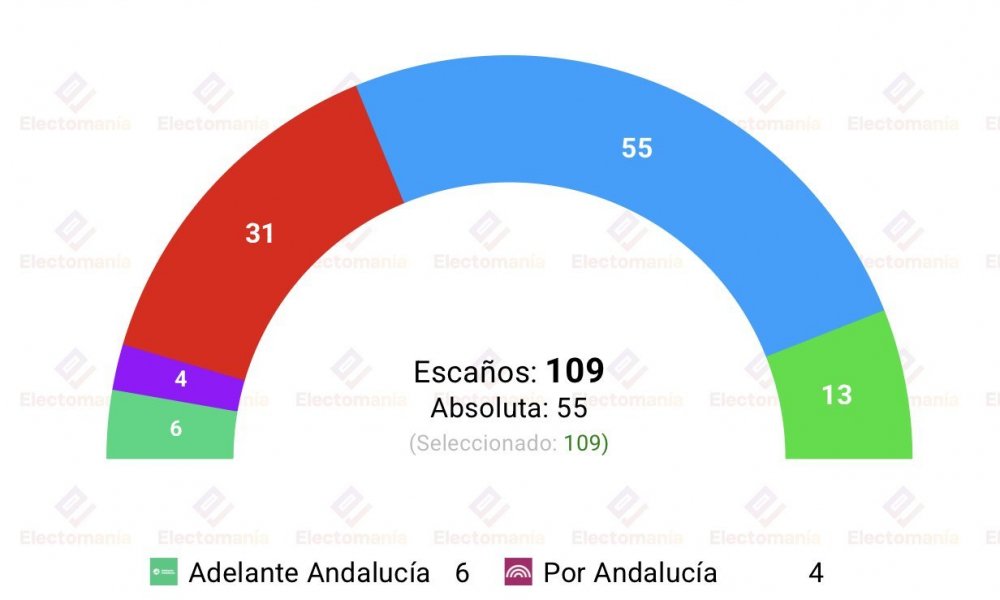 No obstante, las horquilas son un tanto amplias: el PP se movería en una de entre 51 y 59 escaños; el PSOE entre 27 y 34; Vox entre los 8 y los 17 escaños; Adelante Andalucía podría lograr entre 5 y 7 escaños y, por último, Por Andalucía se quedaría entre 4 y 5 escaños.