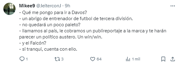 Para una cita entre poderosos en Davos se esperaría ver muchos abrigos de marcas lujosas. Quizá por ello la escena que ha llamado la atención ha sido totalmente opuesta: Sánchez llegaba con un plumas de la marca española Joma. Su precio es de 88 euros https://t.co/SA44G05EMc