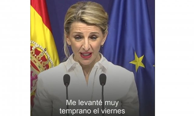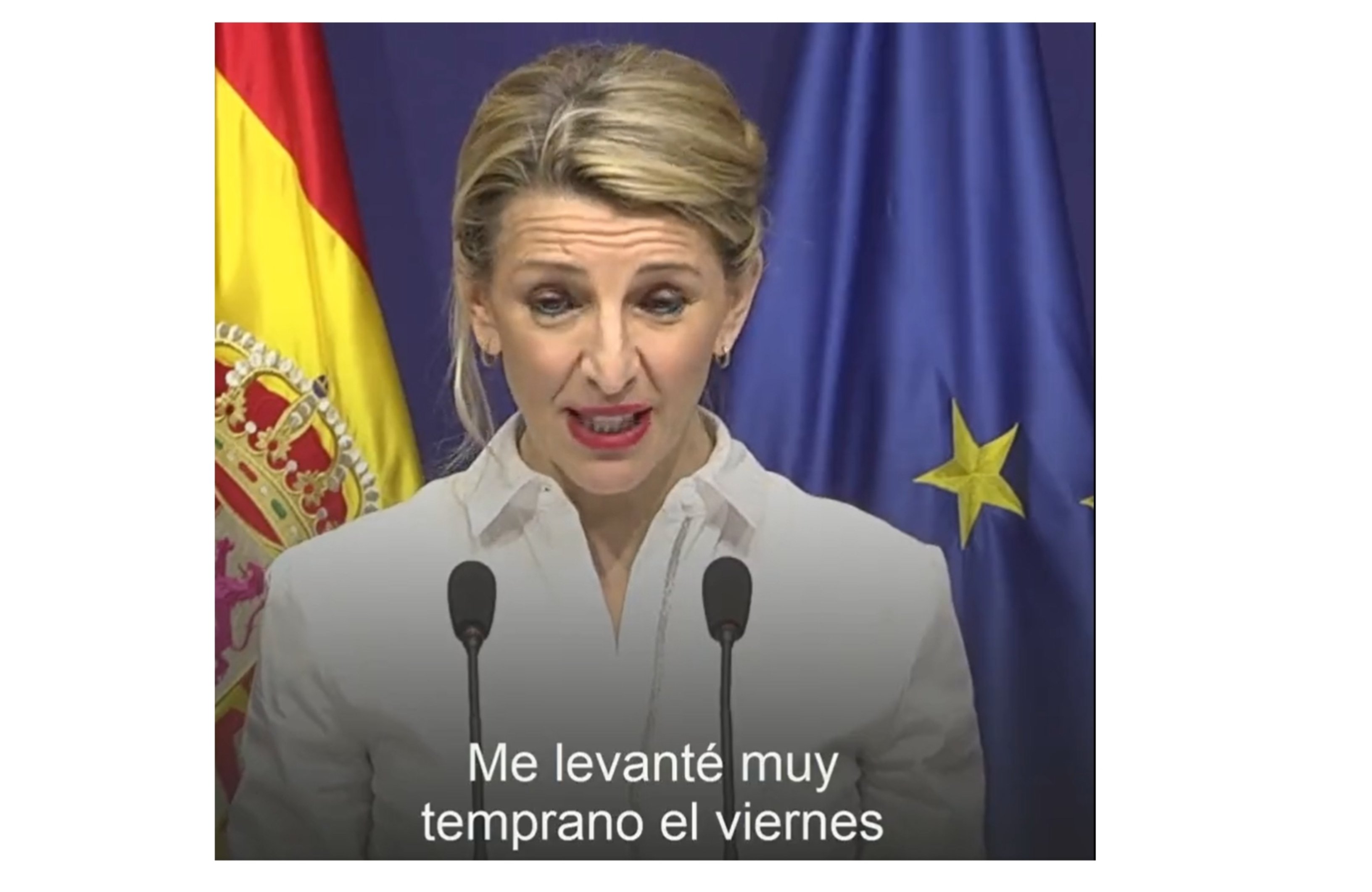 Ahí la tienen, Yolanda Díaz, se solidariza tanto con los trabajadores y trabajadores que nos recuerda que para avanzar en la reforma laboral, se acostó "muy tarde el jueves y se levantó muy temprano el viernes" y, atención, porque nos anuncia "sigo trabajando", por si alguien todavía dudaba.