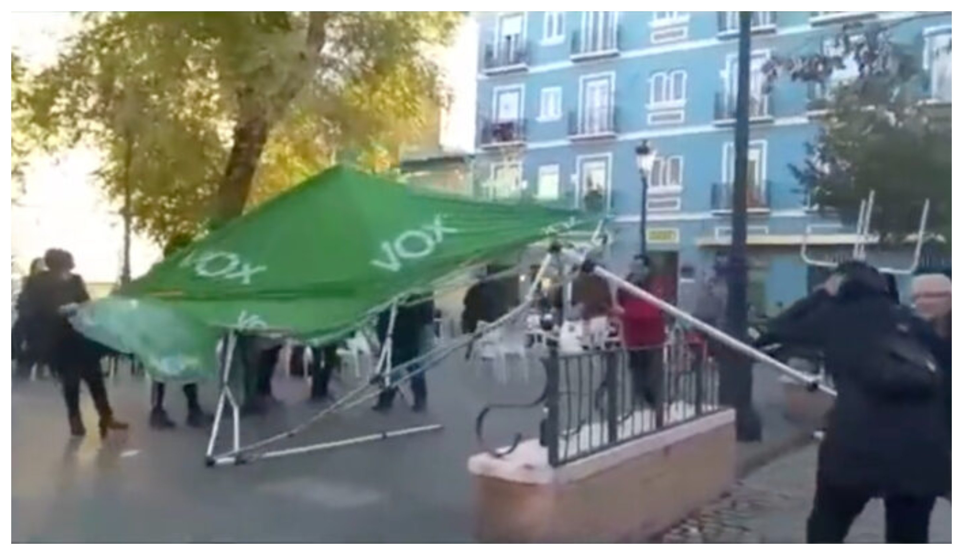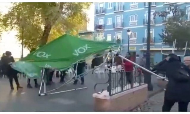 El pasado viernes Vox había instalado un stand como punto de información de la campaña que está realizando en varios barrios de Sevilla, en la Plaza del Pumare. Varias personas se presentaron allí y empezaron a atacar, con insultos, este montaje, hasta el punto de derribarlo e impedir que continuara el acto de información del partido que dirige Santiago Abascal.