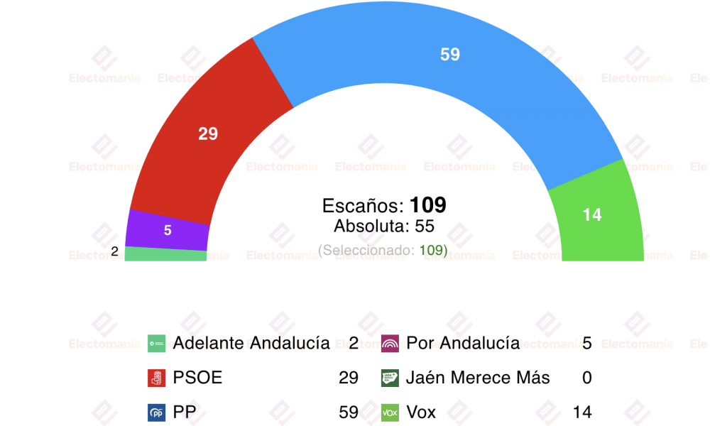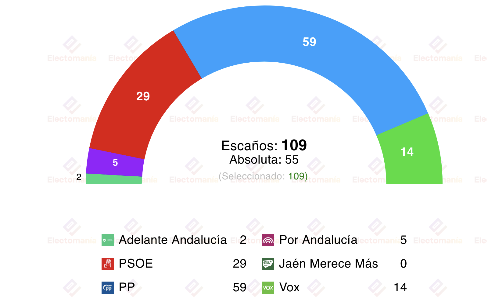 El número total de escaños del Parlamento de Andalucía es de 109, por lo que la mayoría absoluta se sitúa en los 55 escaños.