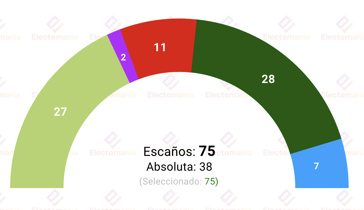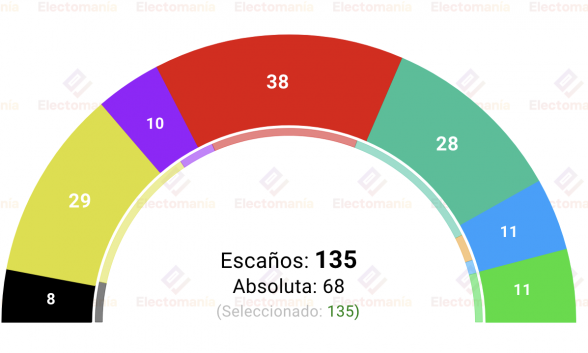 La mayoría absoluta se sitúa en los 68 escaños, de un total de 135.
