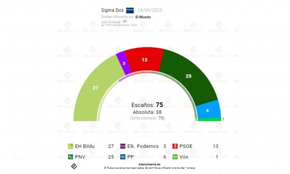El Mundo ha publicado hoy un sondeo de Sigma 2 en el que el panorama electoral en el País Vasco sufriría un vuelco entre las dos principales fuerzas. Porque según esa encuesta, EH Bildu se haría con el 32,5% de los votos y 27 escaños. El PNV obtendría el 32,1% de los votos y 25 escaños. El PSOE conseguiría el 17% y 13 escaños. El PP, el 7,9% y 6 diputados. Unidas Podemos, el 5,1% y 3 diputados. Y Vox, el 2,8% y un escaño.