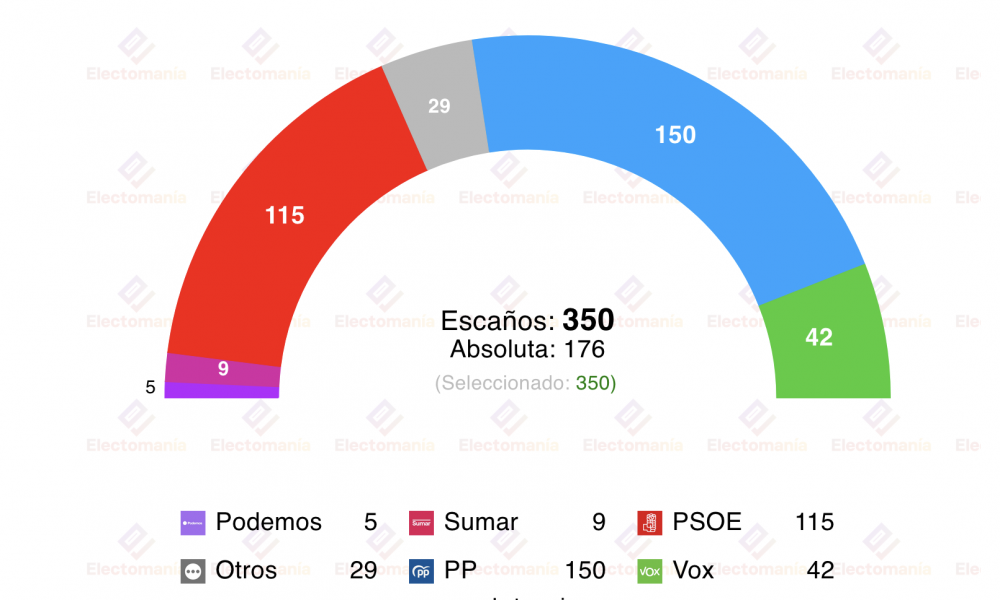 Así las cosas, los resultados son muy similares a los últimos sondeos efectuados en medios de comunicación. A saber: una importante subida del PP y de Vox. Un caída en escaños del PSOE, aunque no muy acusada (tan solo entre 5 y 7). Un descalabro apoteósico de Sumar de Yolanda Díaz, que pierde más de 20. Y un Podemos que tan solo consigue hacerse con 5 ó 6 diputados de esos más de 20 que pierde su antiguo aliado en la coalición.