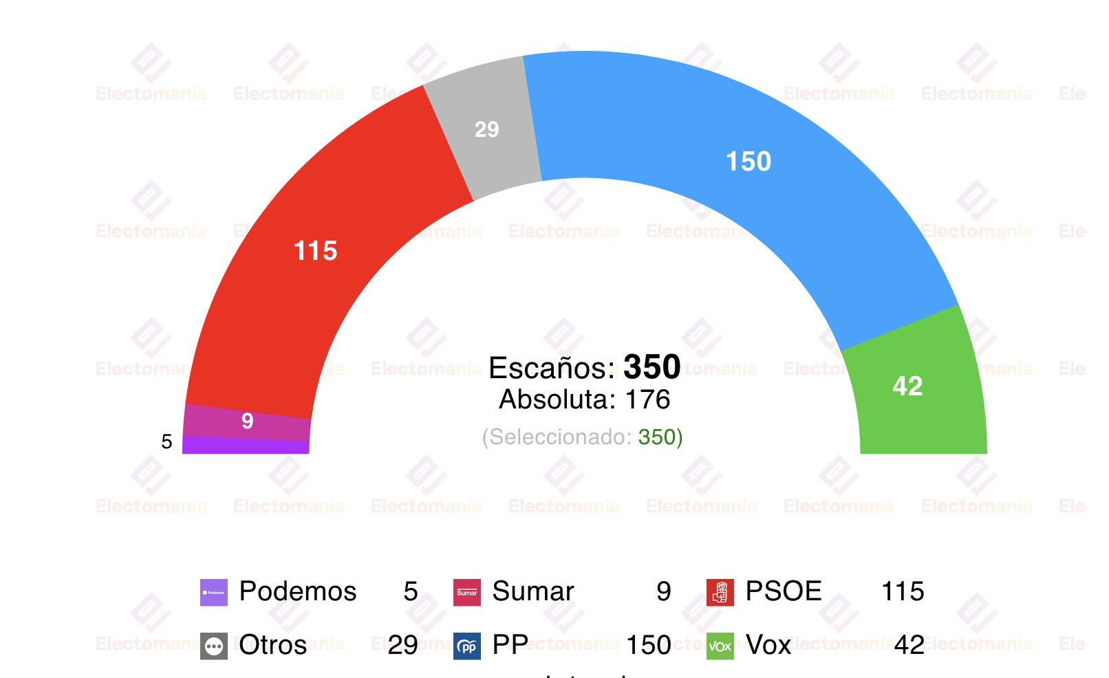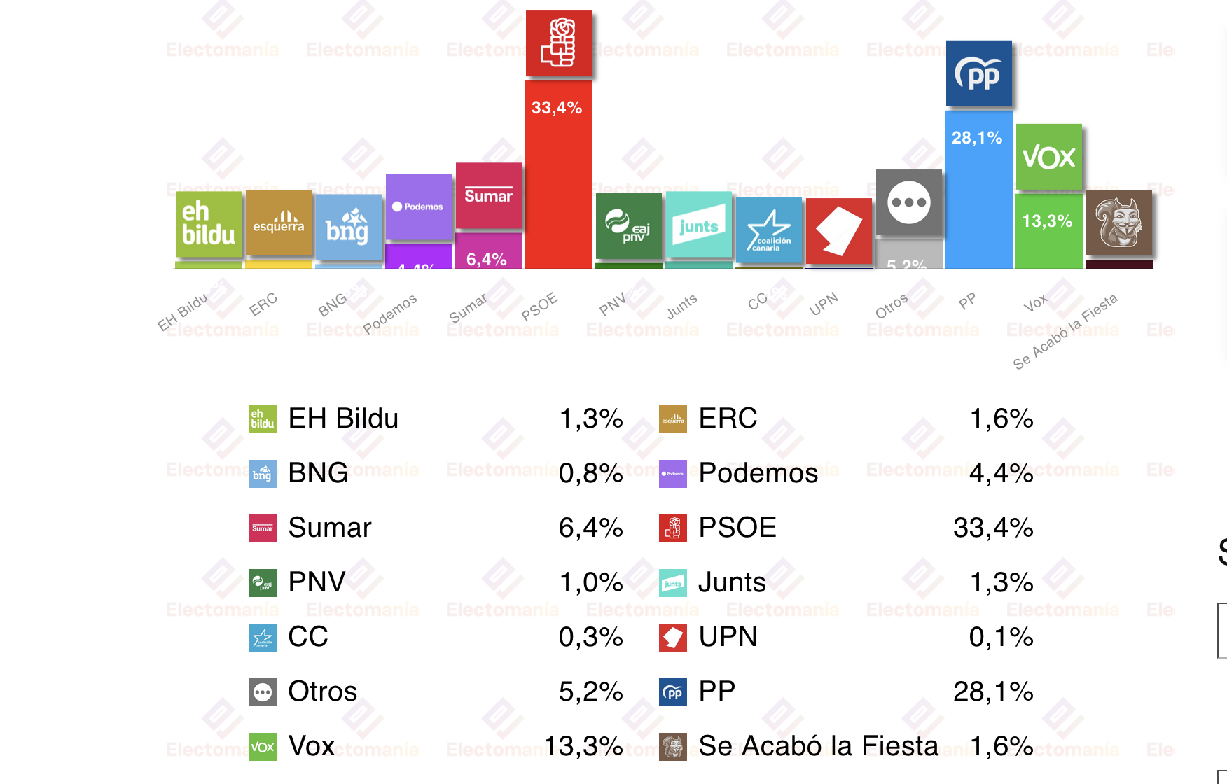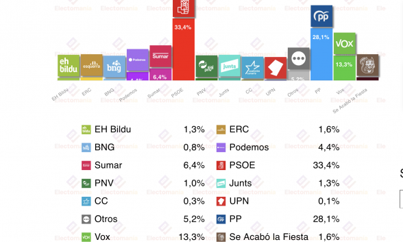 Cabe recordar que en las últimas elecciones generales de julio de 2023, el PP obtuvo 137 escaños y el 33,05% de los votos, el PSOE se hizo con 121 y el 31,70% de los votos, Vox consiguió 33 y el 12,39% de los votos y Sumar 31 y el 12,31%.