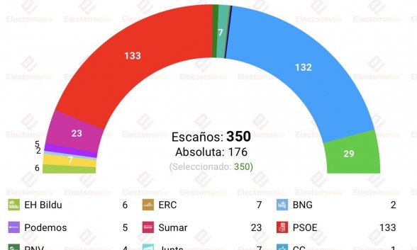 Pero ahora vamos con los resultados de junio, Electomanía los ha recogido y los ha traducido en escaños, por lo que Sánchez sacaría 133 y el 31,7%, Feijóo 132 y el 30,7%, Abascal 29 y el 12,1% y Díaz 23 y el 8,8%. Belarra cosecharía 5 escaños y, aunque Alvise con SALF, conseguiría el 1,5% de los votos, no lograría escaño.