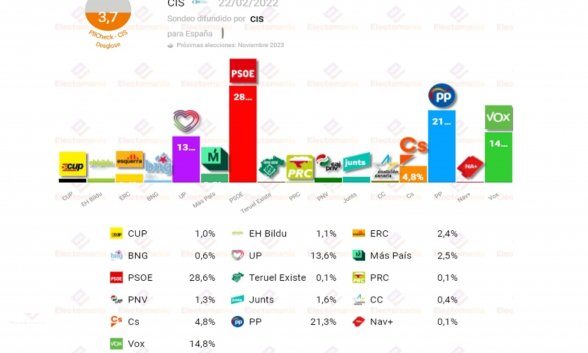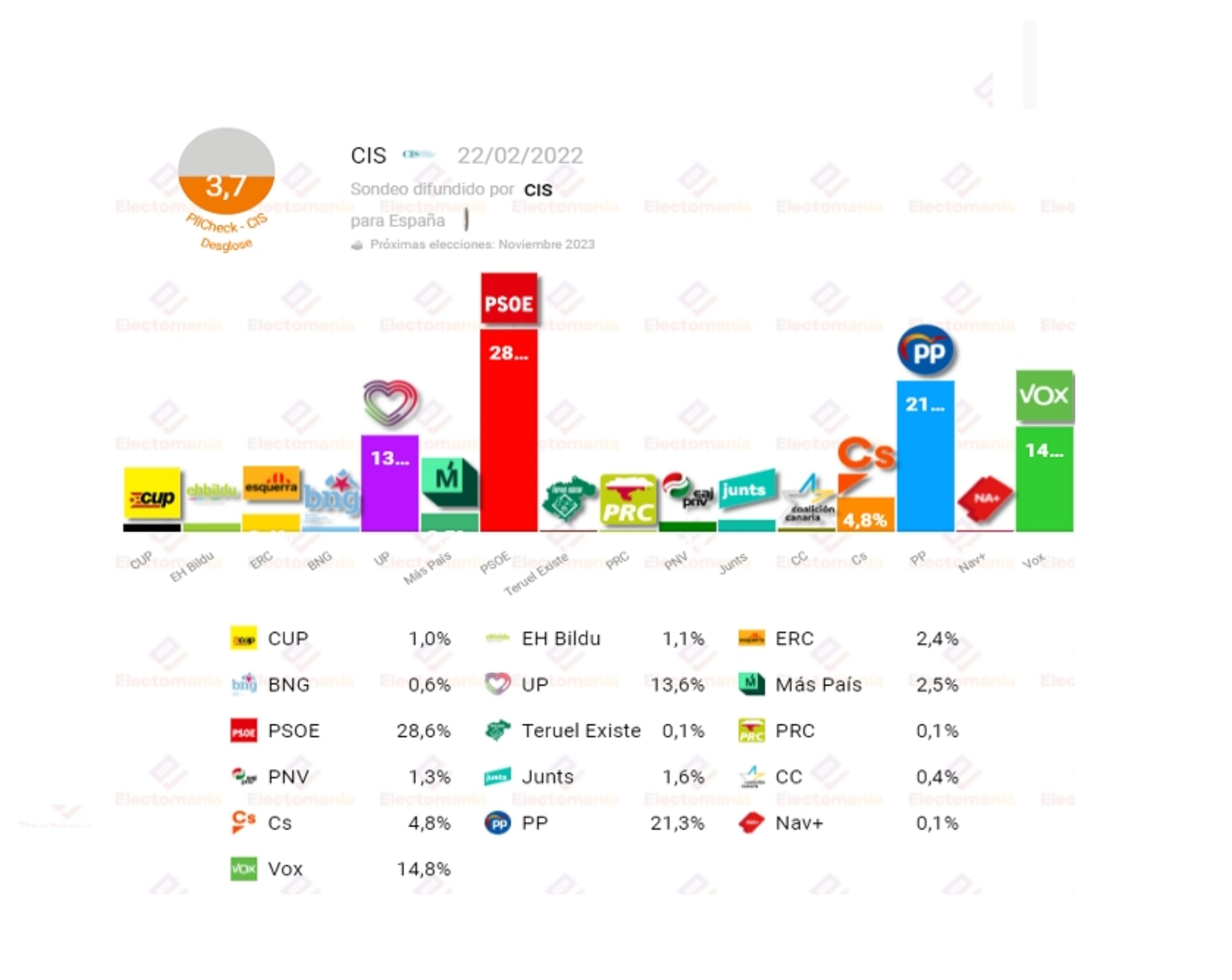 Pero primero, como siempre, recordemos los resultados de las últimas elecciones generales del 10 de noviembre de 2019: el PSOE sacó 120 escaños y el 28% de los votos. El PP, 89 y el 20,8%. Vox, 52 y el 15,1%. Podemos, 35 y el 12,8%. Y Ciudadanos, 10 y el 6,8%.