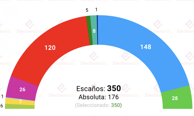 Asimismo, otra encuesta de Sigma 2 para El Mundo concluye que el PP sacaría 151 escaños El PSOE, 123. Vox, 22. Y Sumar, 27. En este caso, la suma de PP y Vox alcanzaría los 173 escaños, y tampoco les daría para gobernar.