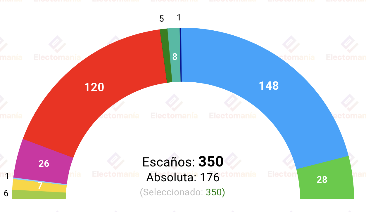 Asimismo, otra encuesta de Sigma 2 para El Mundo concluye que el PP sacaría 151 escaños El PSOE, 123. Vox, 22. Y Sumar, 27. En este caso, la suma de PP y Vox alcanzaría los 173 escaños, y tampoco les daría para gobernar.