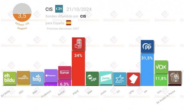El último barómetro del Centro de Investigaciones Sociológicas (CIS), correspondiente a octubre, no va a gustar a Pedro Sánchez... Y es que el PSOE ha reducido su ventaja con el PP a 2,5 puntos, frente a los 4,5 puntos que tenía el mes anterior. ¿Será un bulo?