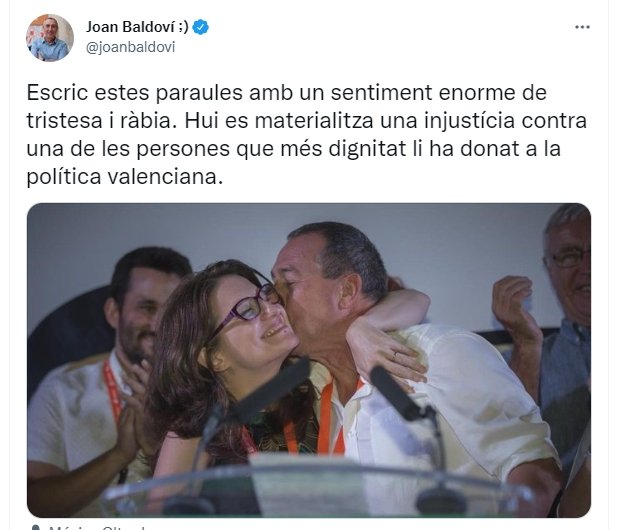Su compañero de partido Joan Baldoví se ha apresurado a publicar un tuit mostrando su apoyo con la ya exvicepresidenta valenciana: "Escribo estas palabras con un sentimiento enorme de tristeza y rabia. Hoy se materializa una injusticia contra una de las personas que más dignidad le ha dado a la política valenciana".