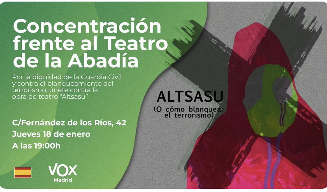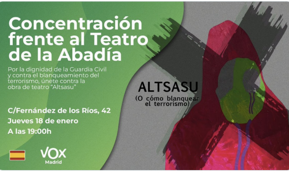 Vox ha organizado una concentración en Madrid, el próximo jueves 18 de enero, a las 19:00 horas, frente al Teatro de la Abadía (calle Fernández de los Ríos 22), para protestar contra la exhibición de la obra de teatro 'Altsasu'.
