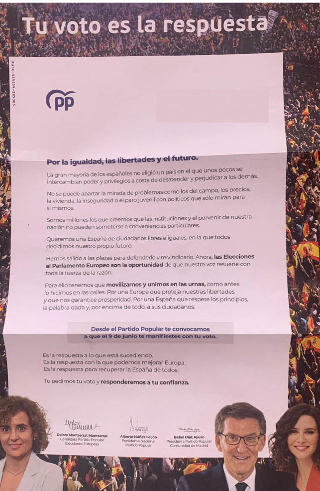 Y por si fuera poco, aquí tienen la carta electoral enviado por el PP de cara a las elecciones europeas: Dolors, Feijóo y... ¿ven una cara que sobresale detrás del gallego? Sí, es Ayuso.