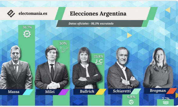 Tampoco se han cumplido las encuestas, que vaticinaban un triunfo de Milei, con un 30,6% de votos y el segundo lugar para Sergio Massa, con un 29,6%.
