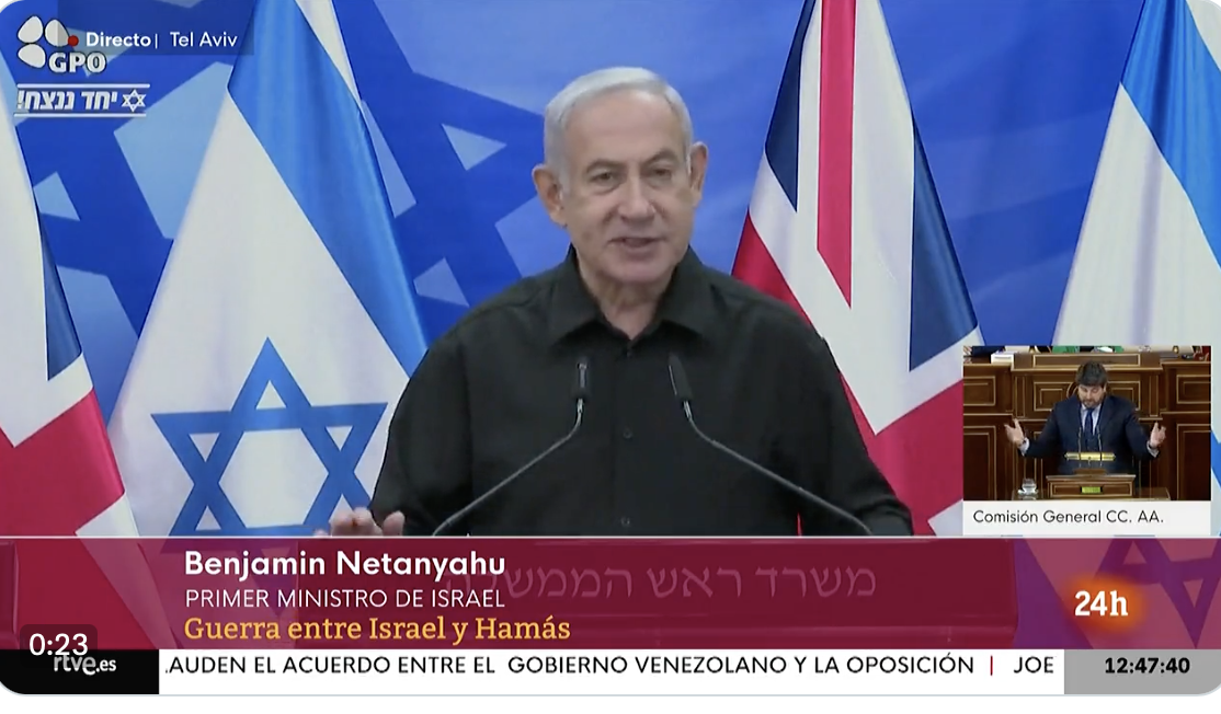 Hoy, en rueda de prensa conjunta entre el primer ministro británico, Rishi Sunak, y el primer ministro israelí, Benjamin Netanyahu, este último ha dicho que hay que destruir a Hamas. También ha explicado que tienen que conseguir que los rehenes sean liberados y agradece el apoyo de Sunak. Asimismo dice que necesitan la unidad de todo el mundo para ganar esta guerra.