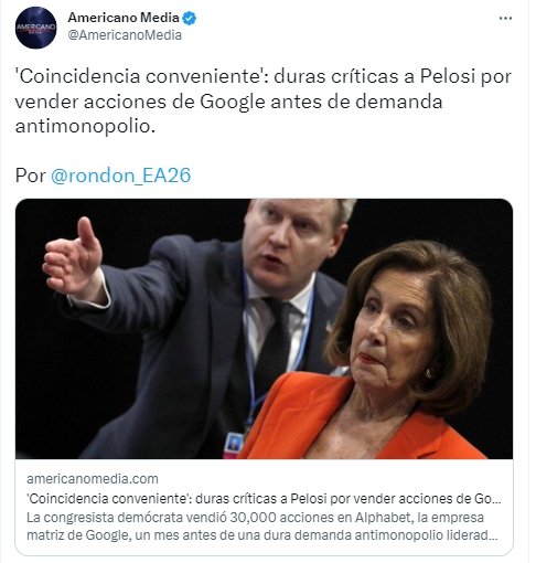 Otros fueron más directos: “No es necesario ser un teórico de la conspiración para preguntarse cómo Nancy Pelosi supo vender 3 millones de sus acciones de Google 4 SEMANAS antes de que el Departamento de Justicia abriera una investigación de monopolio tecnológico en su contra”, tuiteó el veterano y activista conservador, James Bradley.