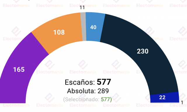 Tras el anuncio del presidente de Francia, Emmanuel Macron, de convocar elecciones legislativas el próximo 30 de junio y el 7 de julio debido a que en las europeas ganó el partido de Marine Le Pen (con el 31,4%), Electomanía recoge una encuesta de Harris que otorga al partido de Marine le Pen, 'Rassemblement National' (Agrupación Nacional, derecha pagana, nacionalismo francés, anti-inmigración ilegal) 230 escaños. El candidato de este partido para primer ministro es Jordan Bardella (no la propia Marine Le Pen, porque ella aspira a la presidencia del país)