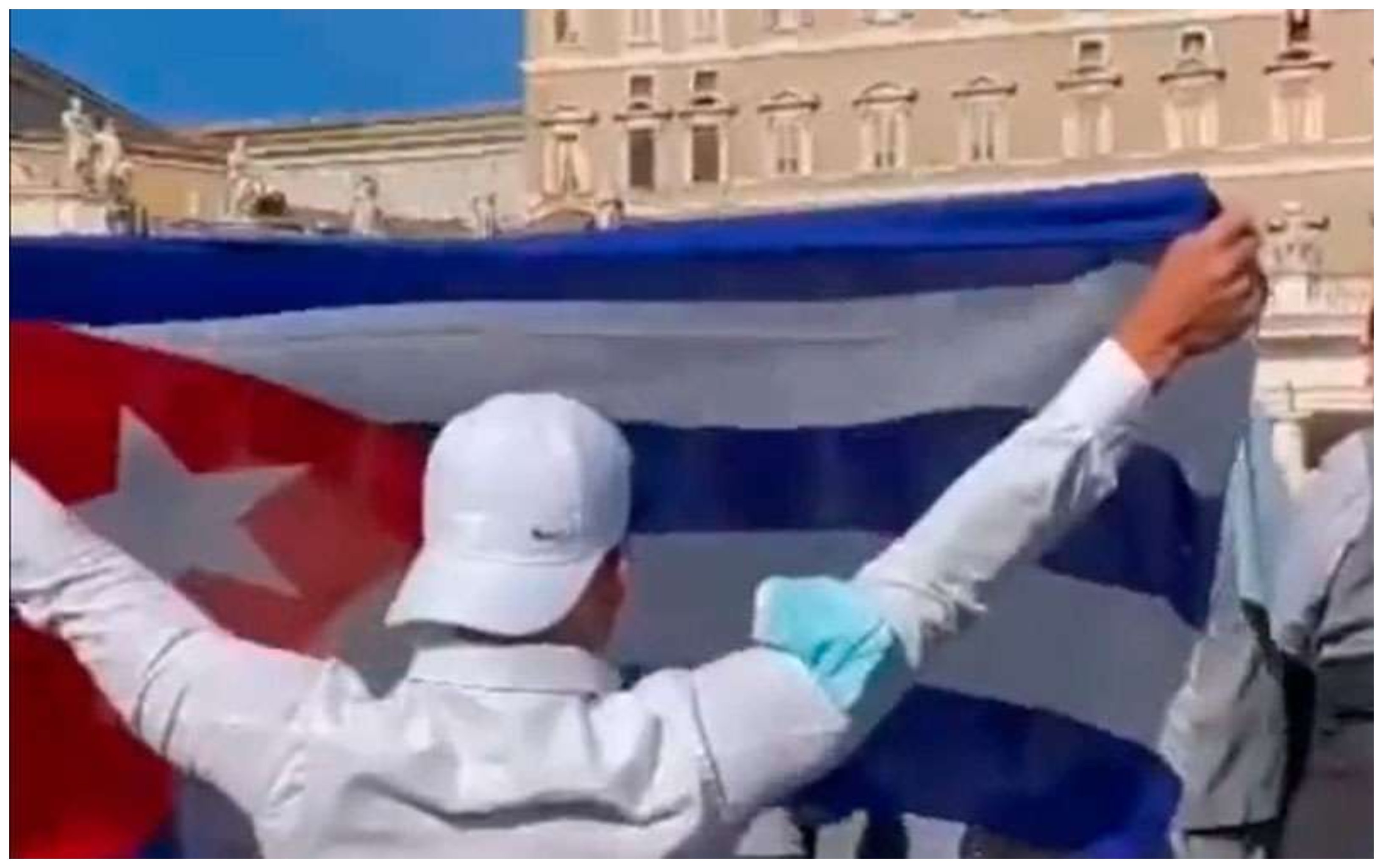 Un joven que sí logró ingresar a la Plaza de San Pedro se arrodilló mientras sostenía extendida una bandera de Cuba mientras el Papa presidía el Ángelus, lo que motivó que agentes de la policía vaticana se la quitaran pese a sus protestas para que no lo hicieran