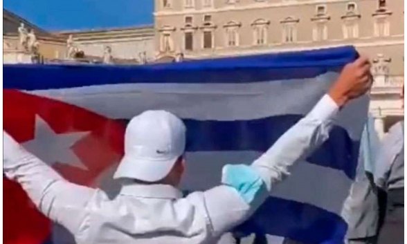 Un joven que sí logró ingresar a la Plaza de San Pedro se arrodilló mientras sostenía extendida una bandera de Cuba mientras el Papa presidía el Ángelus, lo que motivó que agentes de la policía vaticana se la quitaran pese a sus protestas para que no lo hicieran.