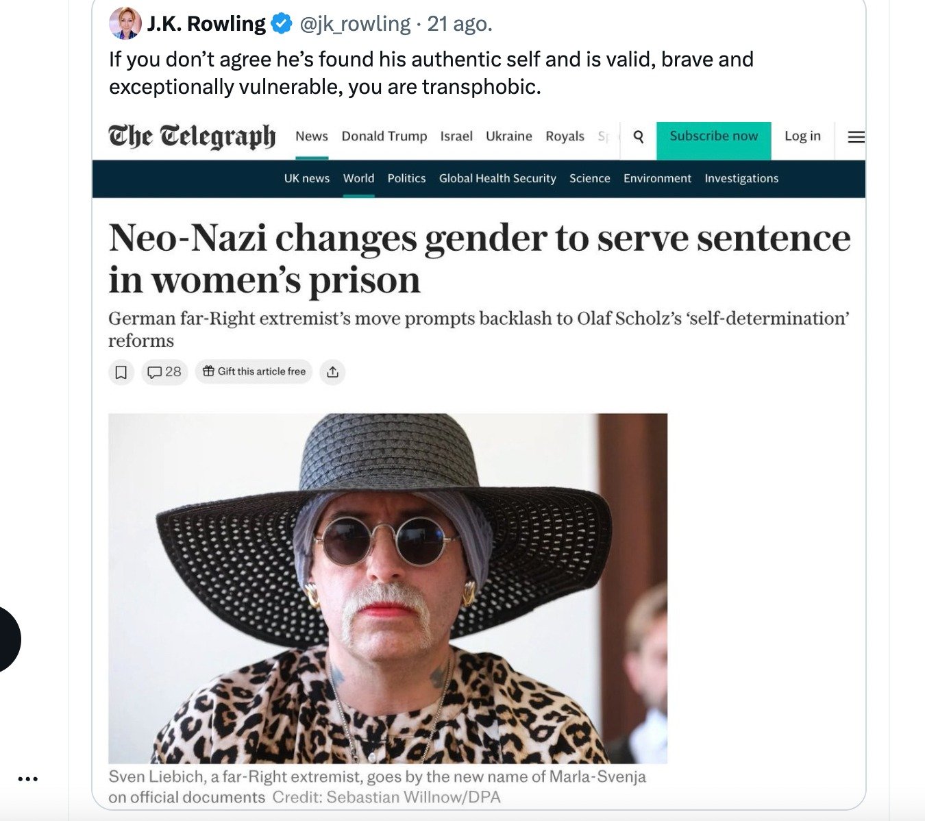 Y en Alemania, también como en España, los nacidos hombres, justo antes de entrar en la cárcel, deciden ser mujeres, y cumplir condena como tal, como denuncia la escritora de Harry Potter, J.K. Rowling, "Si no estás de acuerdo con que ha encontrado su yo auténtico y es válido, valiente y excepcionalmente vulnerable, eres tránsfoba". Por lo que vamos con esta 'bonita' historia.