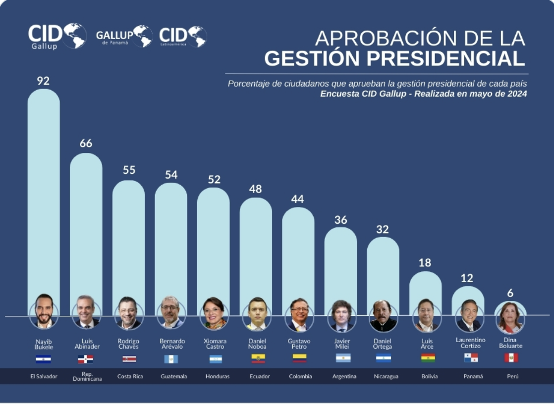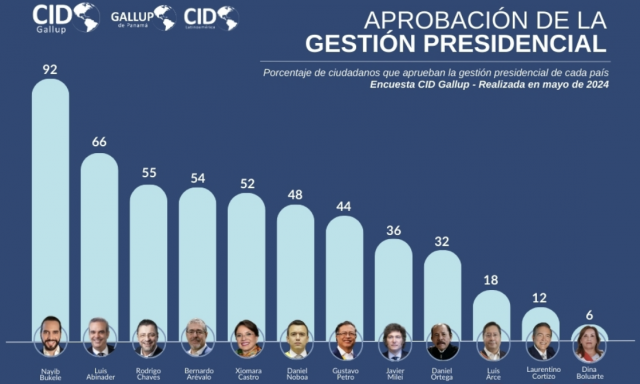 Según la encuesta de Gallup "sobre aprobación presidencial" (es decir, el porcentaje de ciudadanos que aprueban la gestión presidencial) en Iberoamérica, recogida por Electomanía, de nuevo el presidente salvadoreño Nayib Bukele arrasa, con el 92% de aprobación.