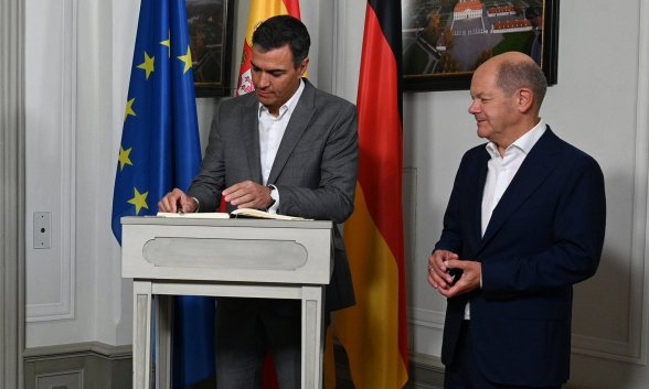Sánchez destaca la gran sintonía entre países y gobiernos con Alemania. Y como ejemplos: el respaldo en el tema de las interconexiones, la cumbre hispano-alemana que se celebrará los días 5 y 6 de octubre y la visista de los Reyes a la Feria del Libro de Fráncfort. ¡Ole!
