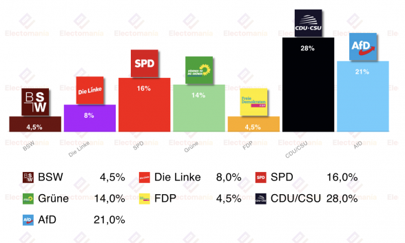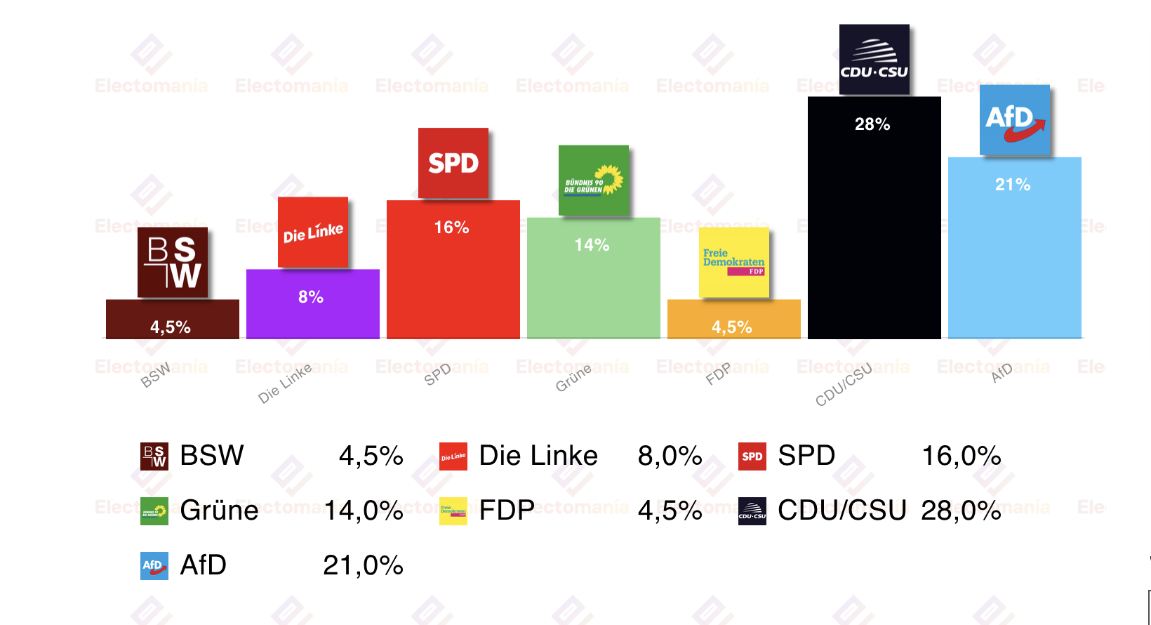 Y después aparecen Die Linke (7%), BSW (5%), Mientras que la FDP (liberales) conseguiría en torno al 4% de los votos (cuando en 2021 se hizo con el 11%).