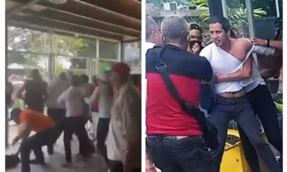 El presidente encargado de Venezuela, Juan Guaidó, fue atacado este sábado en el estado Cojedes por militantes chavistas violentos, que lo empujaron y agredieron físicamente, recoge Infobae.