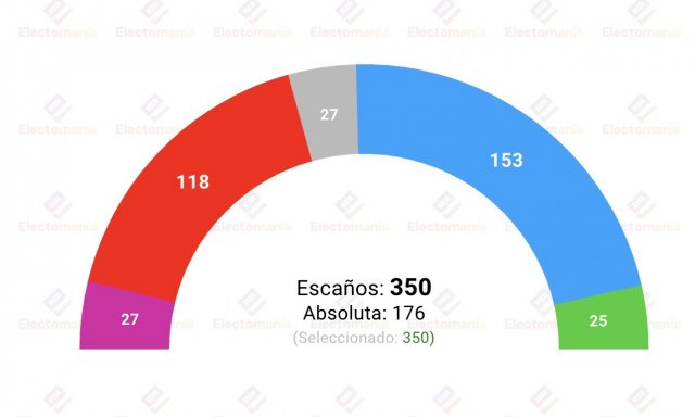 Vox bajaría hasta los 25 escaños, de los 33 actuales que tiene, Sumar se quedaría con 27 representantes. El PP repetiría como ganador de las elecciones con 153 diputados y Sánchez se quedaría con 118.