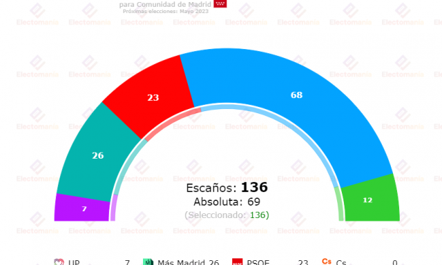 Así, la encuesta de Sigma Dos para El Mundo, recogida por Electomanía, el PP sigue imparable y sube a 68 diputados, a uno de la absoluta que se sitúa en 69, el PSOE sigue bajando y cada vez es más irrelevante con 23 representantes: no nos extraña que no encuentren cadidatos. Algo parecido pasa con Unidas Podemos que también cae a 7 escaños. La sustituta de la izquierda parece ser la Médica y Madre, Me-Ma: Más Madrid sube a 26 diputados, Vox se baja ligeramente y se queda con 12.