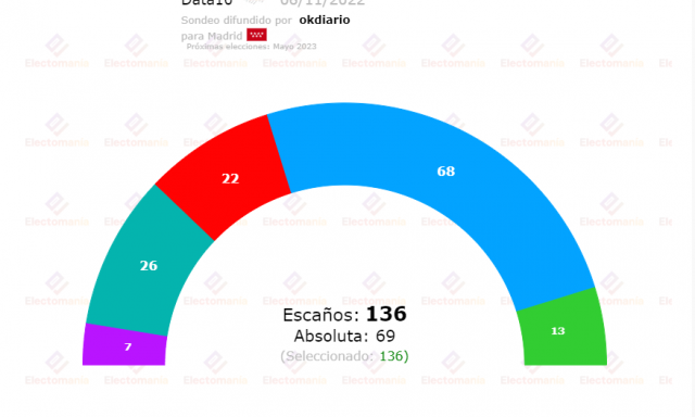 El otro sondeo, de Data10 para OKDiario, también recogida por Electomanía, confirma el fenómemo Ayuso, con un PP disparado a 68 representantes, PSOE bajaría a 22 y Más Madrid subiría hasta los 26 representantes y Vox se mantendría en 13 representantes. Según los datos, Unidas Podemos se quedaría con 7 asientos y Ciudadanos continuaría sin representantes en la Comunidad de Madrid.