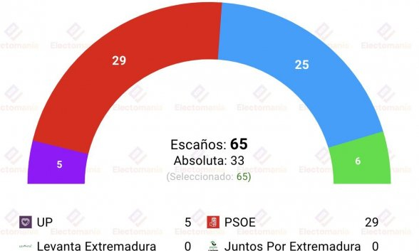 Simple Lógica elabora una encuesta para eldiario.es, que recoge electomanía, de cara las elecciones de mayo en Extremadura. La mayoría absoluta se sitúa en los 33 escaños de un total de 65, por lo que el socialista Guillermo Fernández Vara necesitaría a Unidas Podemos para seguir en el Gobierno.