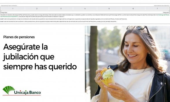 Unicaja Banco cuenta con una completa gama de planes de pensiones para cubrir cualquier perfil de riesgo, desde los más conservadores de Renta Fija a Corto Plazo a los más agresivos de Renta Variable, ofreciendo alternativas para todos los partícipes.