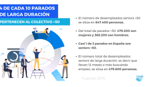 El dato más preocupante es la proporción de parados de larga duración, que afecta a aquellas personas que han estado buscando empleo sin éxito durante un año o más. En el caso de los profesionales mayores de 50 años este dato se sitúa en 479.800 personas, lo que supone un 42% respecto a la cifra total de parados de larga duración de nuestro país.