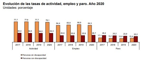 La tasa de paro de la población con discapacidad en España se situó en el 22,2% en 2020, siendo 1,7 puntos inferior a la del año precedente, según los últimos datos publicados por el Instituto Nacional de Estadística (INE), y superando en 6,8 puntos a la tasa de la población sin discapacidad (15,4%). El número de parados con discapacidad se situó en 147.600, reduciéndose un 3,3% frente al año anterior, mientras el desempleo creció un 9,3% entre las personas sin discapacidad.