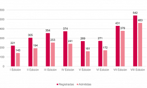(Abajo, gráfico sobre el histórico de candidaturas registradas y admitidas de las ocho ediciones de los Premios Ecoinnovación)