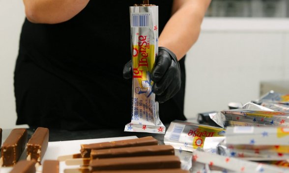 Tras enfriarse, el helado recibe un baño de chocolate que forma una fina capa y se solidifica en apenas treinta segundos. Finalmente, se embolsa a mano, cuidando cada detalle. Pueden llegar a elaborar unas 1.200 unidades en una tarde. Además de sus conocidos bombones de nata, este negocio también vende otros dulces como el turrón -que introdujo la tercera generación- y otros helados de sabores.