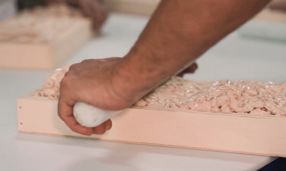 Tras enfriar la pasta resultante, pasa a un molino con dos piedras circulares de granito junto con la almendra tostada. Es como una gran picadora y el resultante, con textura casi líquida, se deja enfriar y se mete en un boixet, un mortero donde la maneta no golpea, solo baja y sube removiendo esa masa suavemente mientras el calor del vapor configura la consistencia y la textura. El maestro turronero la tienta, coge una pizca, siente la temperatura. Ya tiene el color del tradicional turrón de Jijona, el blando. En total, todo el proceso, desde que llega la almendra cruda hasta que sale empaquetado, también a mano, dura casi cinco días. Para el turrón de Alicante -el duro-, que también se hace aquí, se necesitan tres.