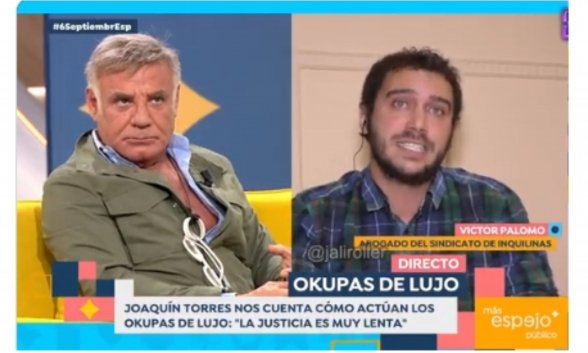 En 'Espejo Público' de Antena 3, se trataba el asunto de la okupación. El arquitecto Joaquín Torres, a quien le han okupado más de una vivienda, respondía a Víctor Palomo, abogado del Sindicato de Inqulinos e Inquilinas, para quien los medios "sobreexponen" los casos de okupación... que, por otro lado, opinaba el letrado, no son tantos.