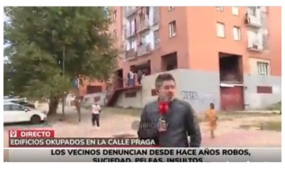 La calle Praga en Alcorcón sufre la okupación de dos de sus edificios. Hasta allí se desplazó un equipo de 'Buenos días' de Telemadrid, que fue agredido con piedras por un grupo de okupas de etnia gitana y sus hijos menores de edad.