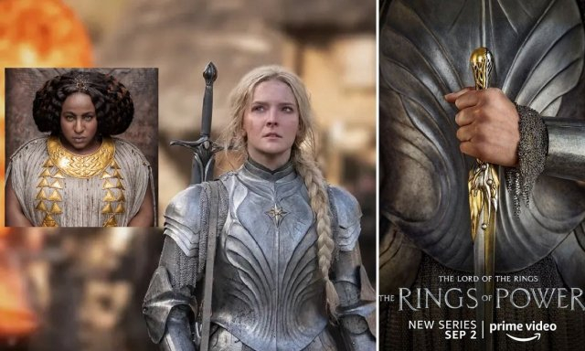 Por ejemplo, se puede ver a un elfo ‘blandito’ en el compañero con el que habla el elfo Arondir, y este último es afrodescendiente cubriendo parte de la cuota. Claro que no sólo eso, también tiene una relación prohibida con una sureña, Bronwyn, una madre soltera y sanadora de las Tierras del Sur a quien sus vecinos no valoran. Pero la cuota afrodescendiente va mucho más allá: se puede ver a la enana Disa, esposa del príncipe Durin IV; o al sabio líder de los pelosos, Sadoc Madriguera. Y cómo no, hay símbolos de feminismo: se puede ver a la elfa Galadriel empoderada como terca y guerrera frente al mal al asumir la misión de su hermano (Finrod Felagund), que fue asesinado por Sauron, y se sitúa lejos de la sabia y etérea Dama de Lórien que será en el futuro; a Bronwyn como madre soltera y sanadora en las Tierras del Sur; a la enana Disa; o a la curiosa pelosa Nori (que ayuda a un extraño personaje que llega del cielo).